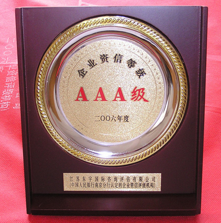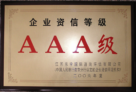 近日,公司再次获得江苏东宇国际咨询评估有限公司授予的AAA级企业资信等级铜牌,该机构是中国人民银行南京分行认定的企业资信评级机构,这已经是集团公司自2003年以来连续4次获得了。