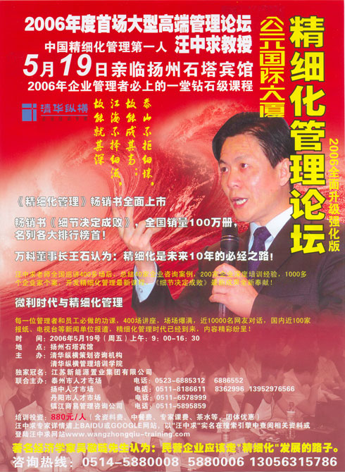 由公元国际大厦独家冠名的2006年度首场大型高端管理论坛精细化管理论坛将于5月19日在石塔宾馆隆重举行。中国精细化管理第一人汪中求教授将亲临现场为企业管理者讲授一次钻石级课程。公元国际大厦作为甲级写字楼为业主提供了高品质的创业平台,精细化管理则是每一个现代企业所倡导的管理理念,是未来十年的必经之路。据悉,凡公元国际大厦业主均可获赠价值888元门票一张和汪中求《精细化管理》力作一本。
