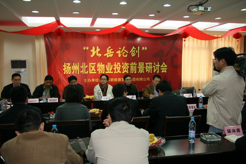 4月11日,由江苏新能源置业集团有限公司举办的扬州北区物业投资前景研讨会; 在公元国际大厦会议室隆重召开。江扬工业园管委会、维扬区建设局、维扬区规划局、维扬区商贸局领导,扬州大学房地产研究所、东南大学房地产研究所、中国房地产策划协会专家学者及江扬商贸城等北区相关在建项目负责人参加了此次会议。