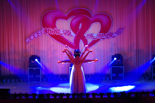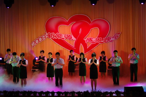 新能源一年一度的感恩节,是新能源回报社会、做大做强企业文化的集中展示。在感恩节晚会上,手语操《感恩的心》、配乐诗朗诵《让感恩之花四季飘香》、烛光舞《感恩之夜》等20多个职工自编自演的节目,充分表达了新能源人面对危机,自强不息、敢于创新、永做一流的企业精神,赢得了观众阵阵掌声。