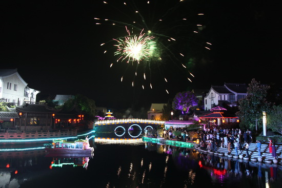 中秋节的豪第坊.扬州院子一片欢声笑语,装饰一新的各种彩灯为节日的夜晚增添了喜庆的气氛,大红的中国结分布在树上、桥梁、路旁,祝愿新能源业主的生活红红火火。