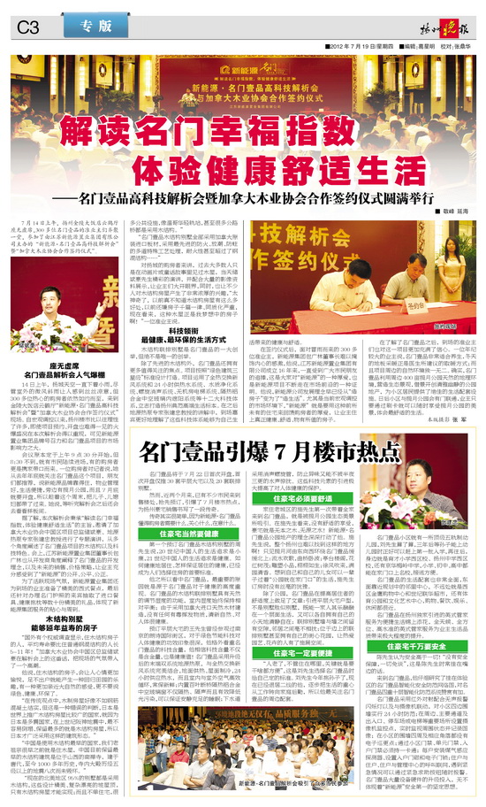 7月14日上午,扬州金陵大饭店云鹤厅座无虚席,300多位名门壹品的准业主们齐聚一堂,参加了由江苏新能源置业集团有限公司主办的新能源名门壹品高科技解析会;暨加拿大木业协会合作签约仪式;。