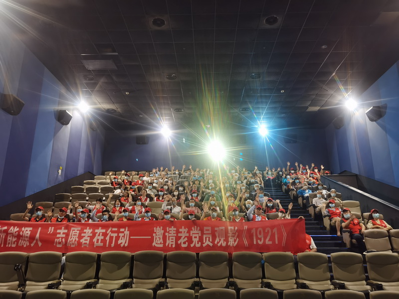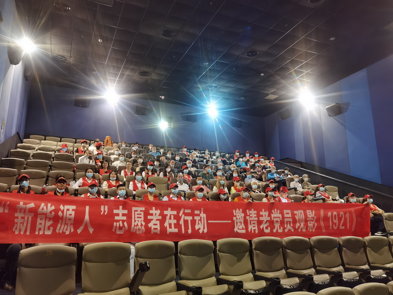 “新能源”立足扬州,开发了30多个高质量的居住小区。“七一”来临,新能源置业党支部组织党员志愿者,登门走访了居住在各个新能源小区的40年党龄以上的近100位老党员,送上慰问品,征求他们对物业服务工作的意见和建议。7月17日,新能源置业党支部专门包了一辆大巴车,到各个小区接送这些老党员,邀请他们观看电影《1921》,进行了一次生动形象的党史宣传教育。