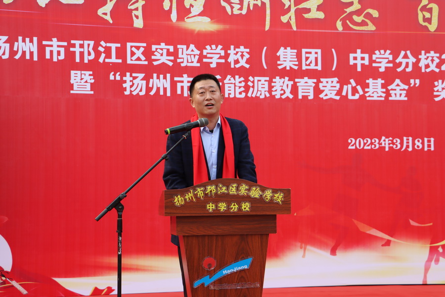 3月8日,“新能源教育爱心基金”2022-2023 学年度颁奖仪式在邗江区实验学校举行,江苏新能源置业集团总裁王秋云、邗江区教育局副局长、邗江区实验学校校长葛光等领导参加活动。